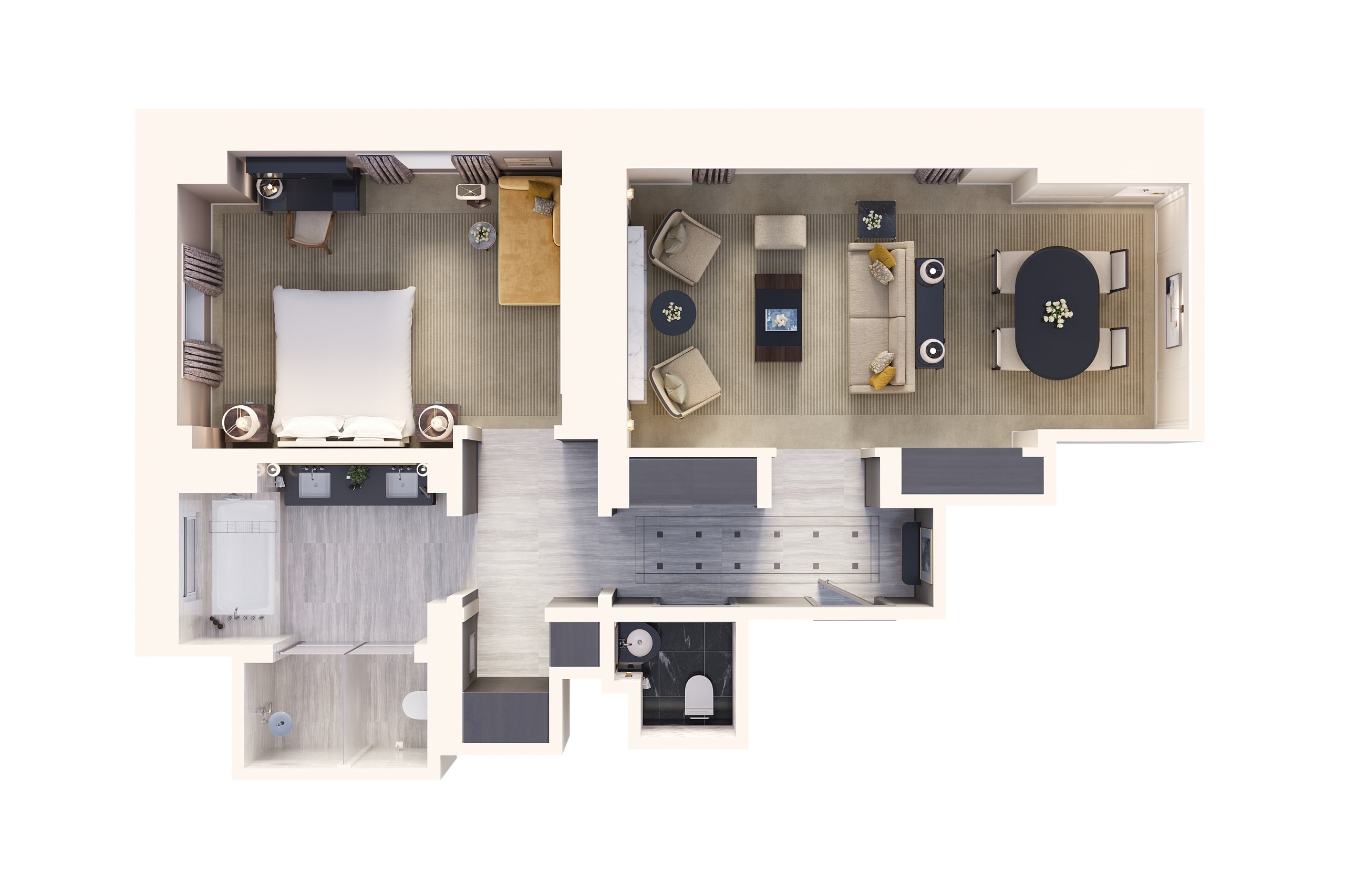 An expansive oasis of refined elegance and magnificent city views, the Premier One Bedroom Suite offers a living and dining area, tastefully embellished with custom finishes and elegant details. With a sumptuous king bed and spacious walk-in dressing room, the bedroom is a peaceful retreat into luxury. The spa-like bathroom invites you to further unwind and rejuvenate with a rain shower and deep soaking tub.