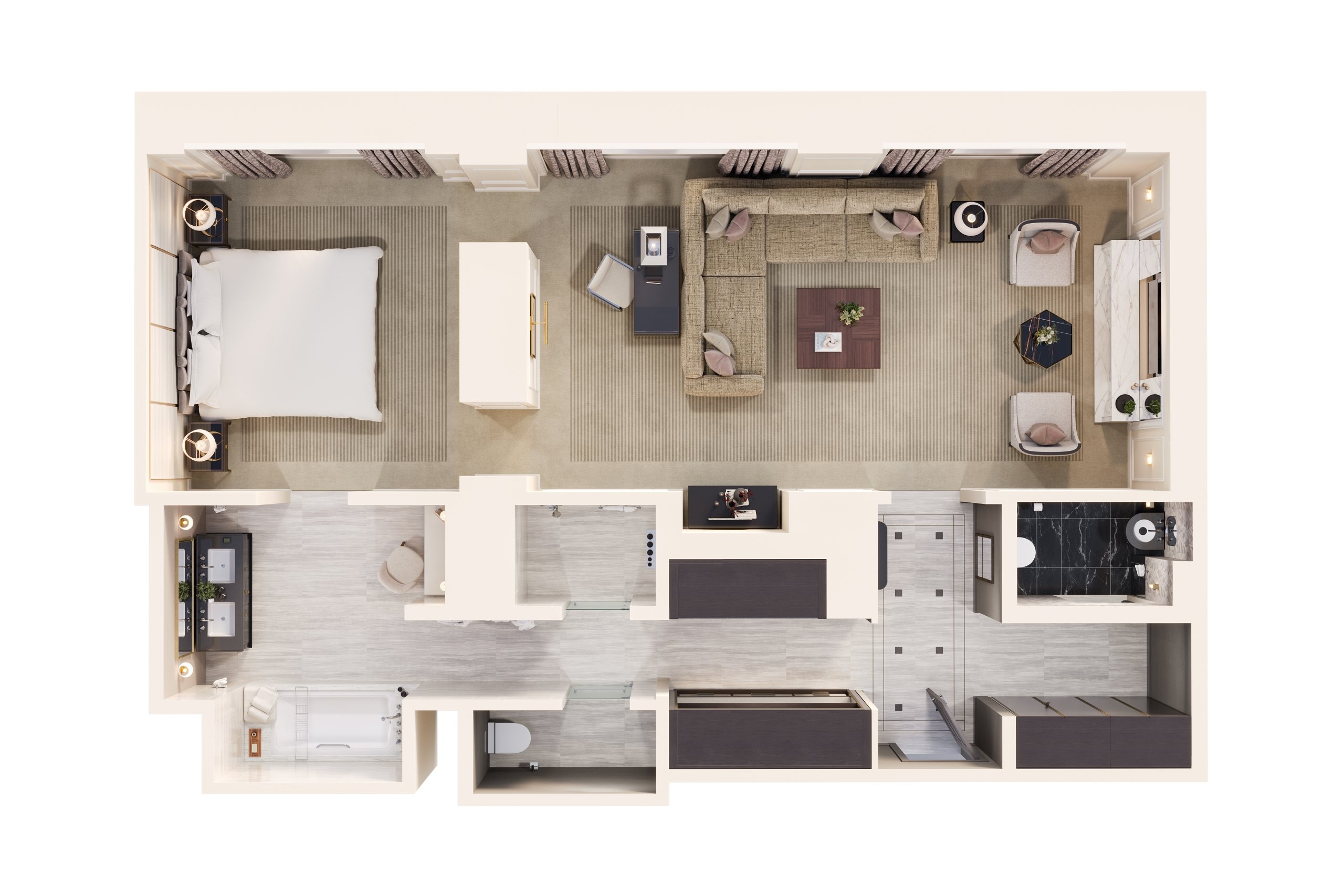 With iconic city views and a spacious floor plan, the One Bedroom Suite offers a serene retreat above the hustle and bustle of the city. The suite features a separate living room, while the bedroom provides an inviting sanctuary with a king bed, walk-in dressing room, and its own seating area. The spa-like bathroom is a haven of tranquility with a deep soaking tub, double marble vanity, and a glass-enclosed shower. Designed for both comfort and sophistication, this suite offers an unparalleled New York City experience.
