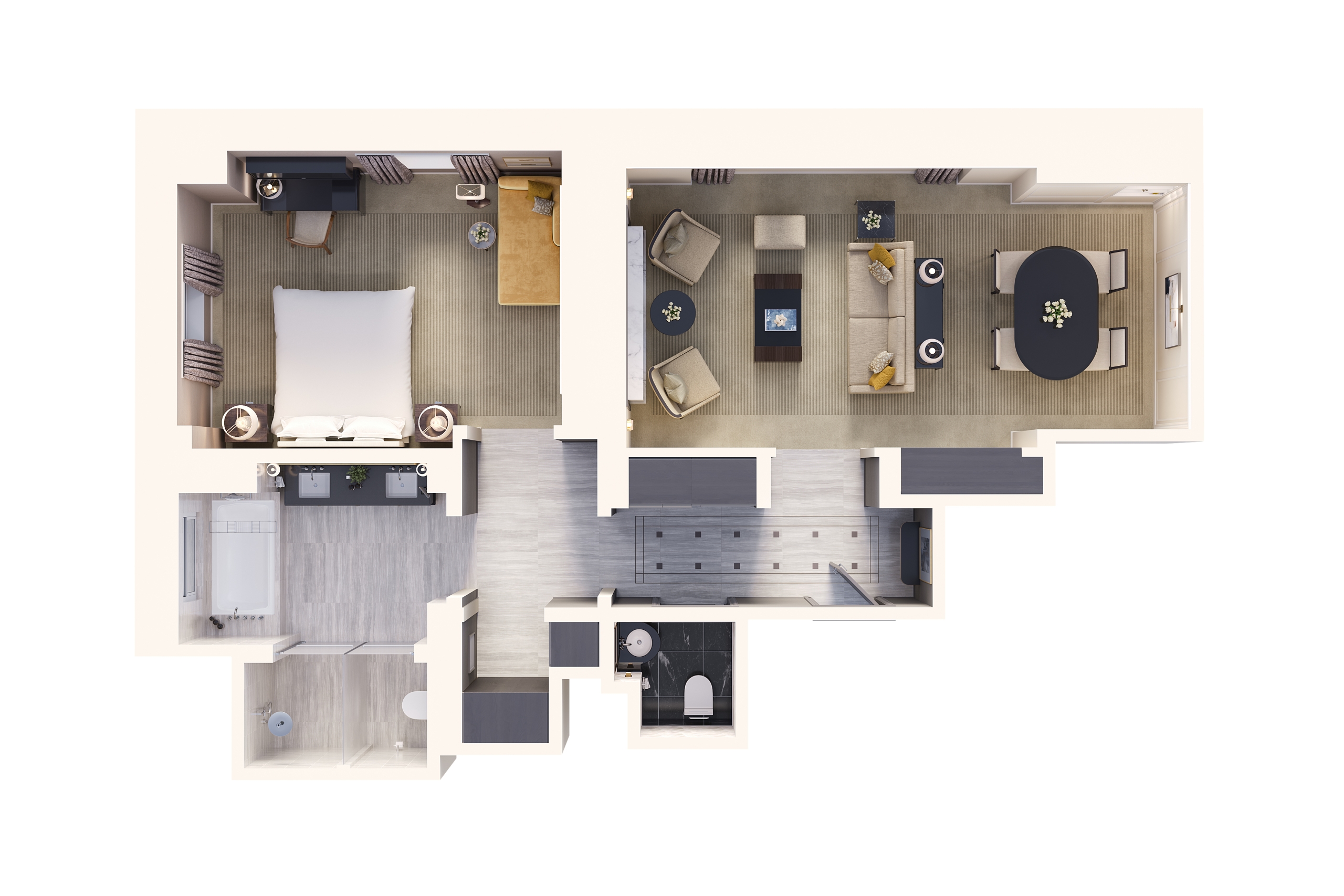 洗練されたエレガンスと壮大なシティビューが広がるオアシス、プレミア1ベッドルームスイートには、特注の仕上げとエレガントなディテールで上品に飾られたリビング&ダイニングエリアがあります。豪華なキングサイズベッドと広々としたウォークイン ドレッシングルームを備えたベッドルームは、贅沢な安らぎの隠れ家です。スパのようなバスルームには、レインシャワーと深めのバスタブがあり、ゆったりとおくつろぎいただけます。